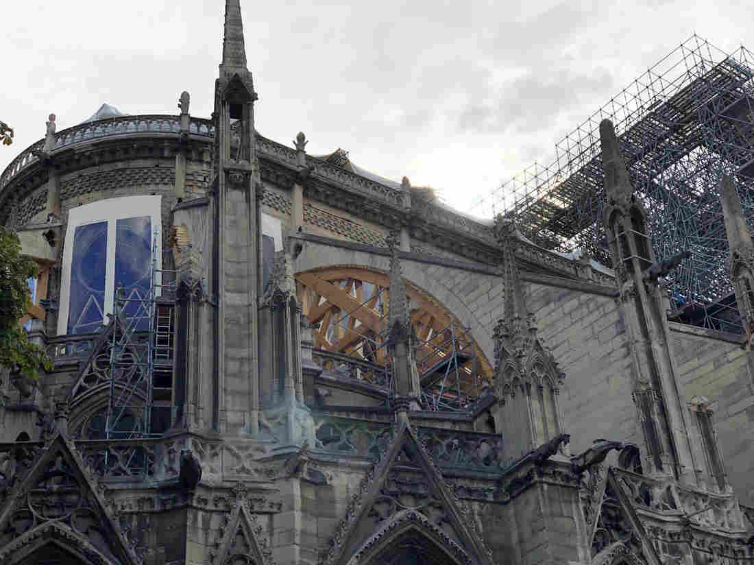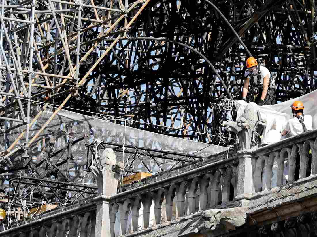 Repairs on the fire-damaged cathedral had been suspended for three weeks. New safety measures are now in place as the work resumes. Jake Cigainero for NPR hide caption