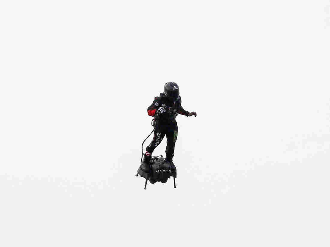 The board moved quickly – almost immediately after takeoff, Zapata rose high in the sky and blasted forward, standing up on his invention as he faded off into the distance above the water. The crowd clapped as they saw him off from the beach.